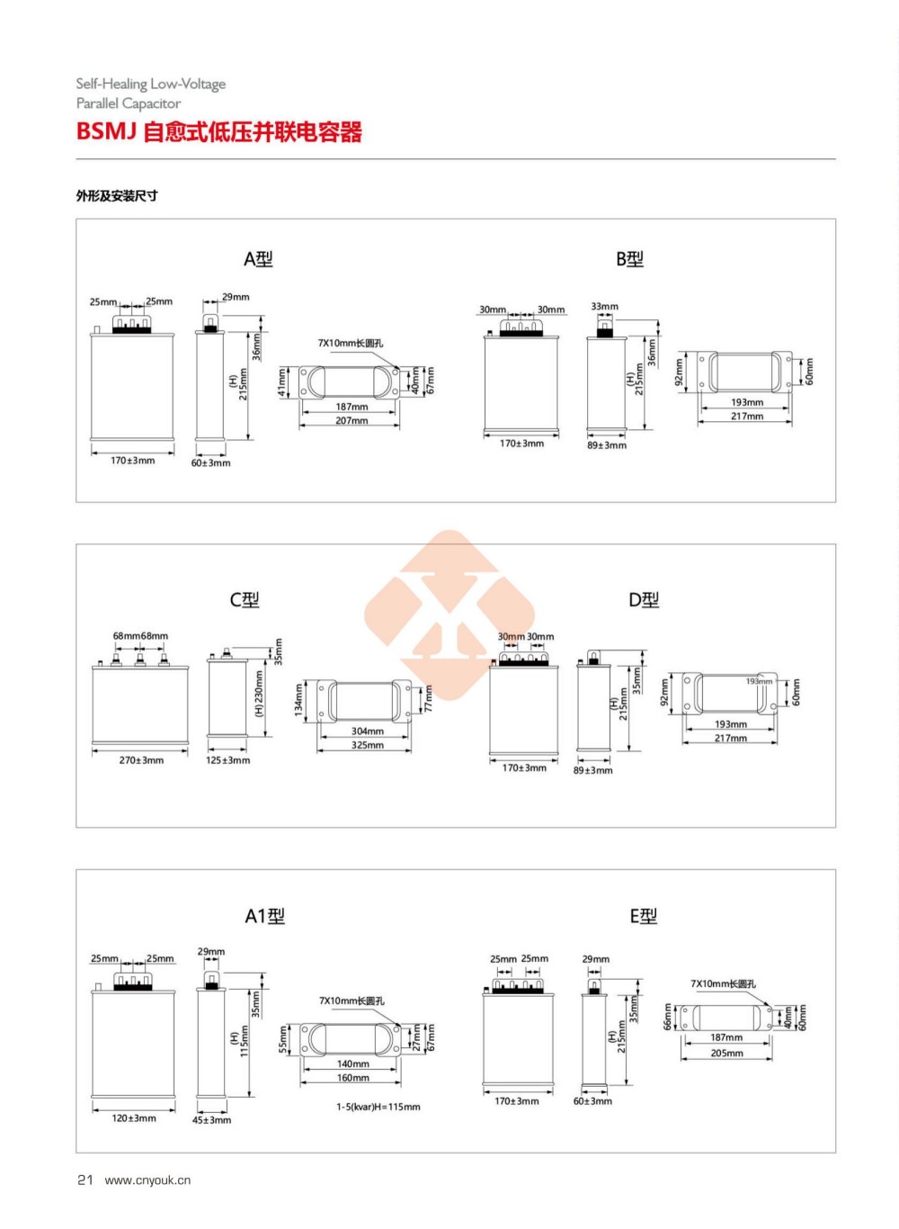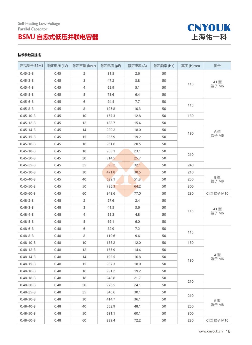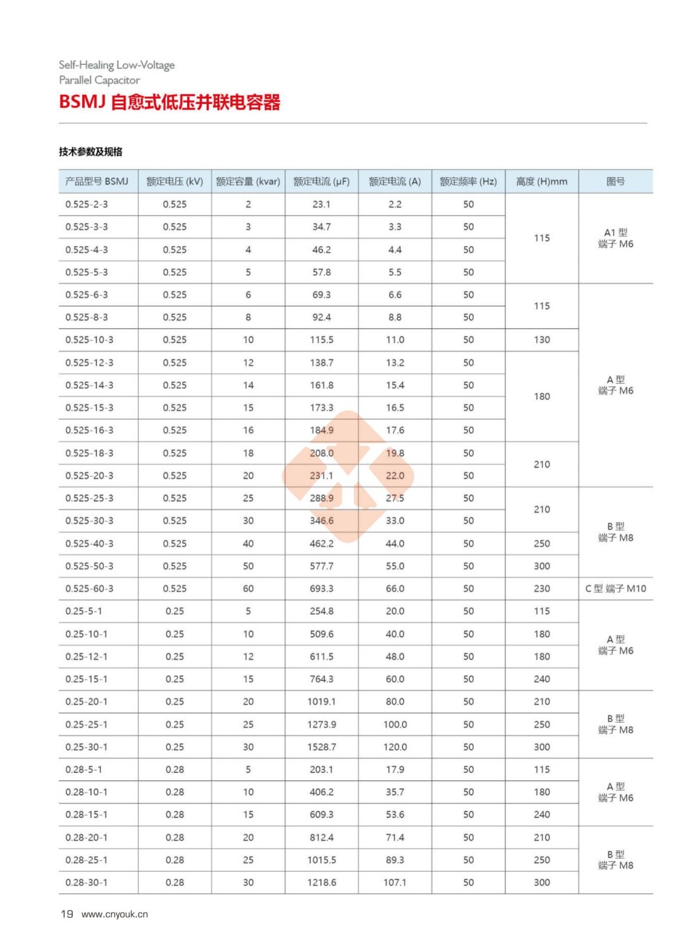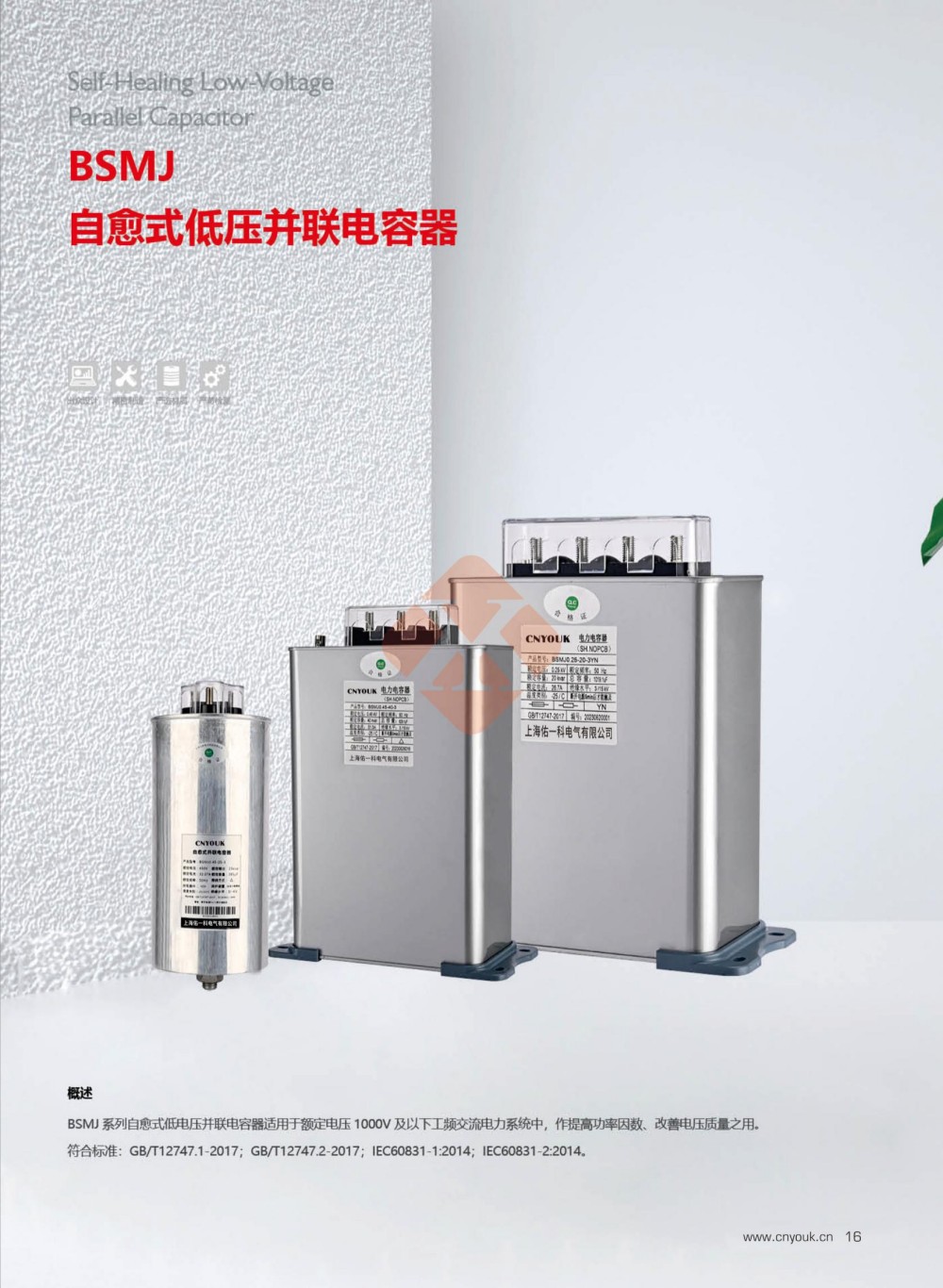 BSMJ系列自愈式低电压并联电容器适用于交流50Hz(60HZ), 额定电压1000V及以下交流电力系统中,作提高功率因数、降低无功损耗、改善电压质量之用。